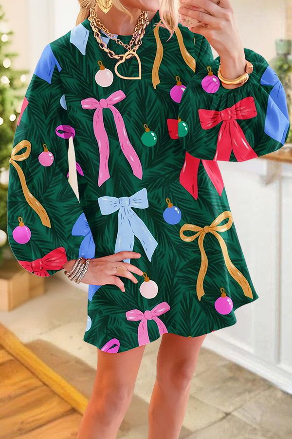 Christmas Tree Colorful Bow Puff Sleeve Dress