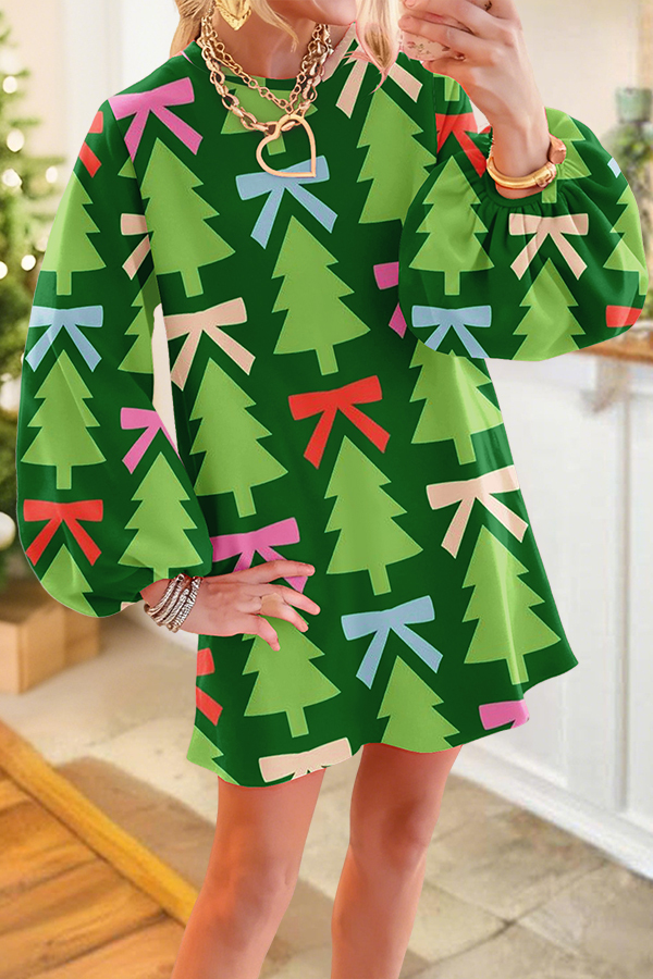 Cute Christmas Tree Bow Puff Sleeve Dress