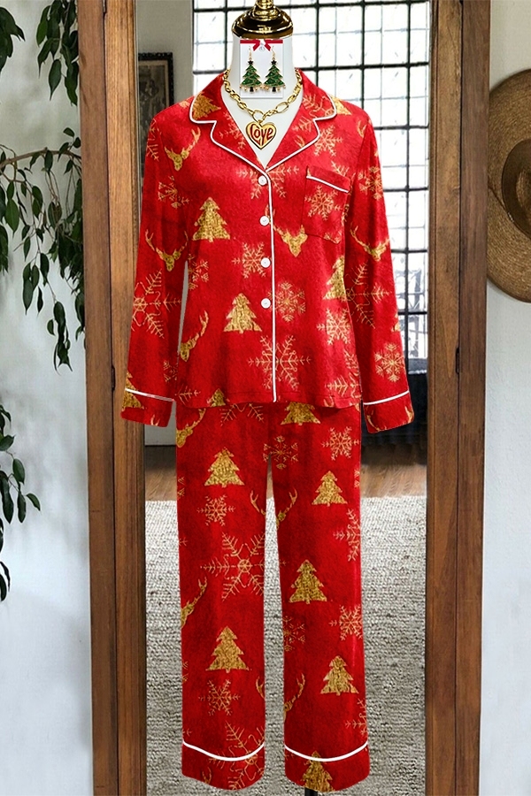 Stay on trend this season in our new casual, lapel set. We especially love the holiday fabric and think this piece will be a new favorite in your closet!