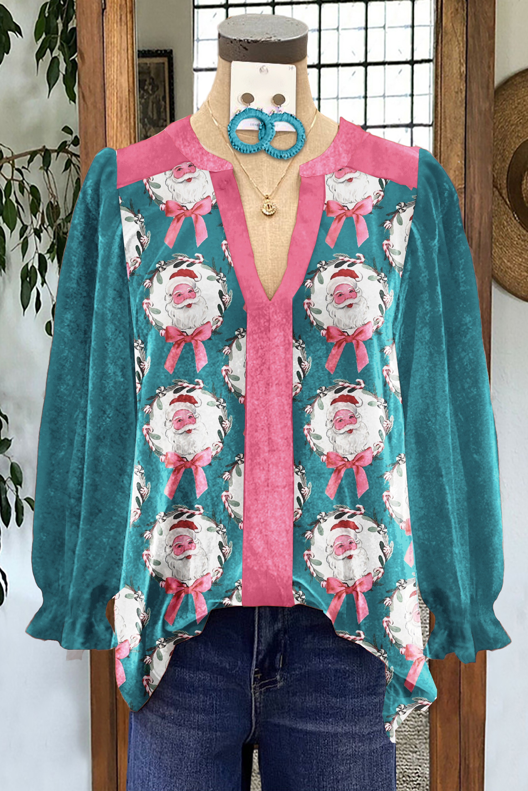 Velvet Christmas Print V-Neck Top
