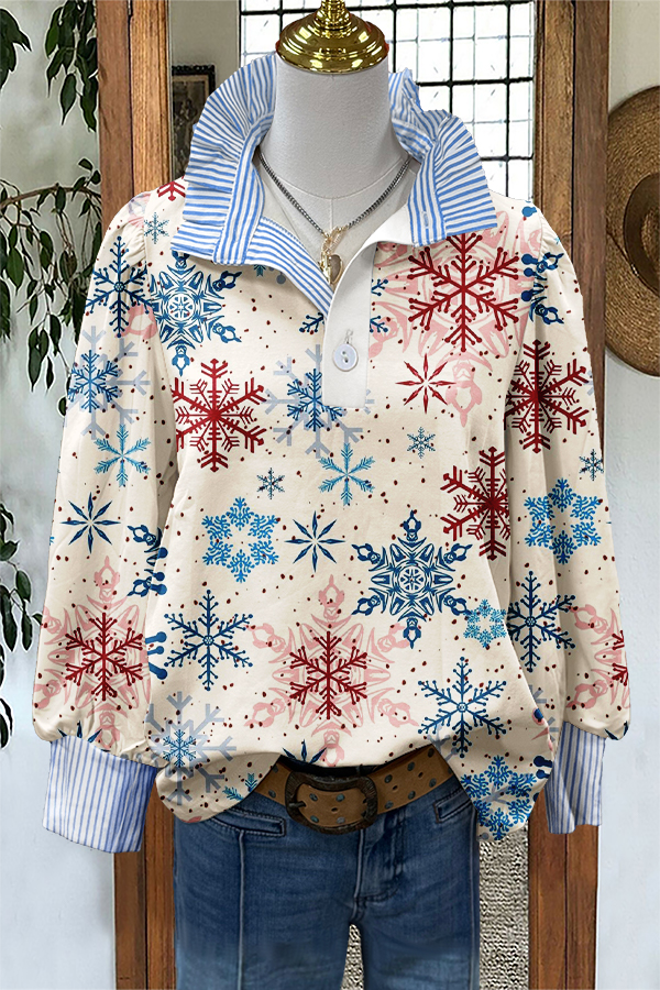 Classic Christmas Snowflakes Print Puff Sleeve Blouse