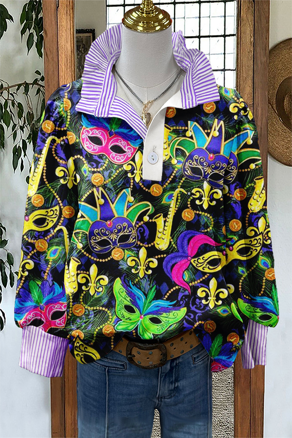 Unique Mardi Gras Print Puff Sleeve Blouse