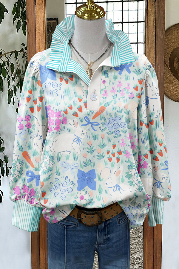 Cute Easter Bunny Print Puff Sleeve Blouse