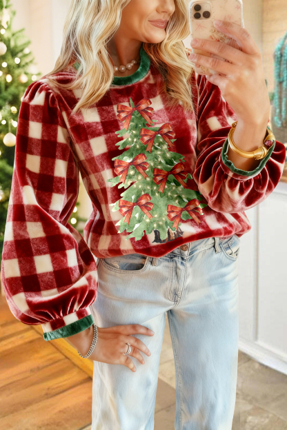 Vintage Christmas Tree Plaid Velvet Blouse