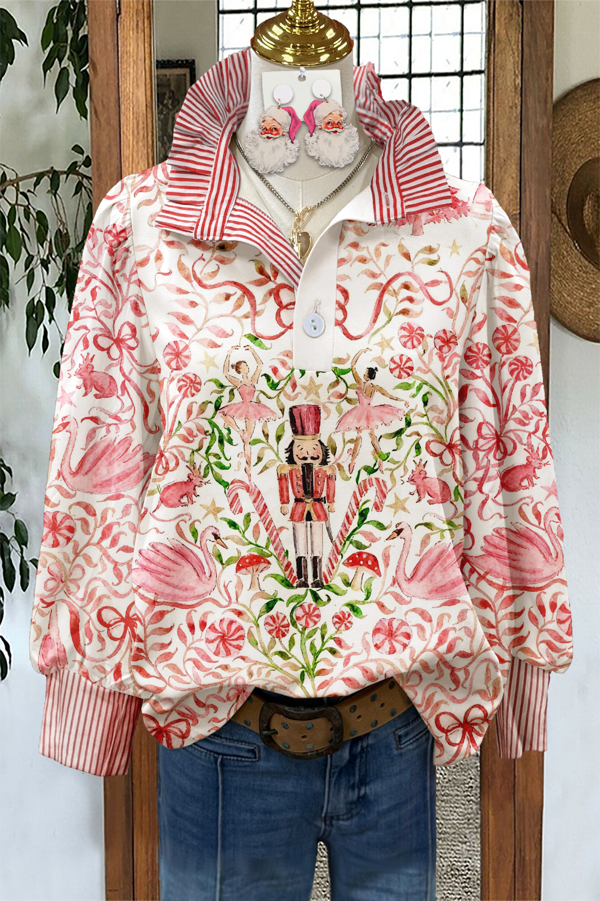 Fresh Christmas Striped Stand Collar Blouse