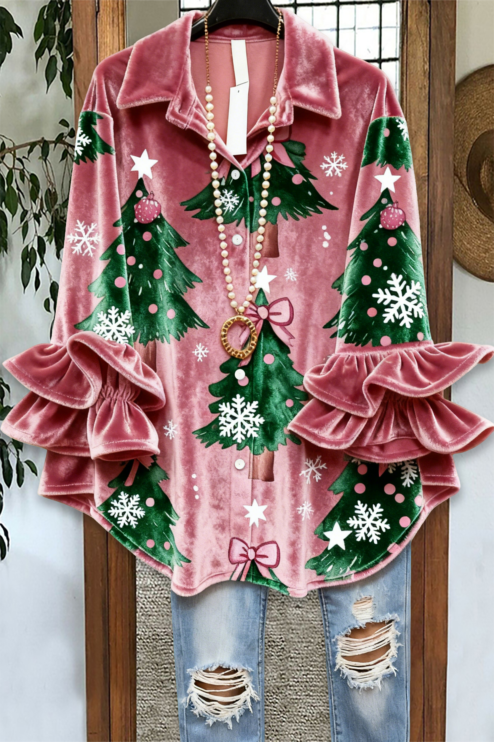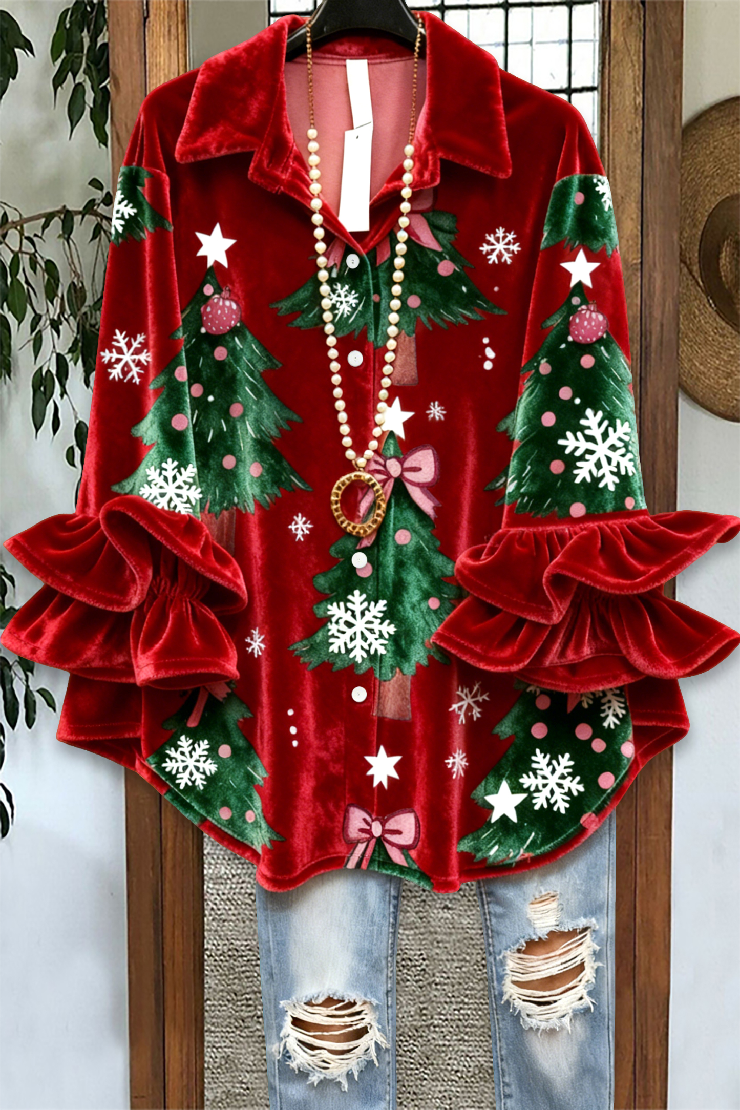 Christmas Tree Ruffle Velvet Blouse