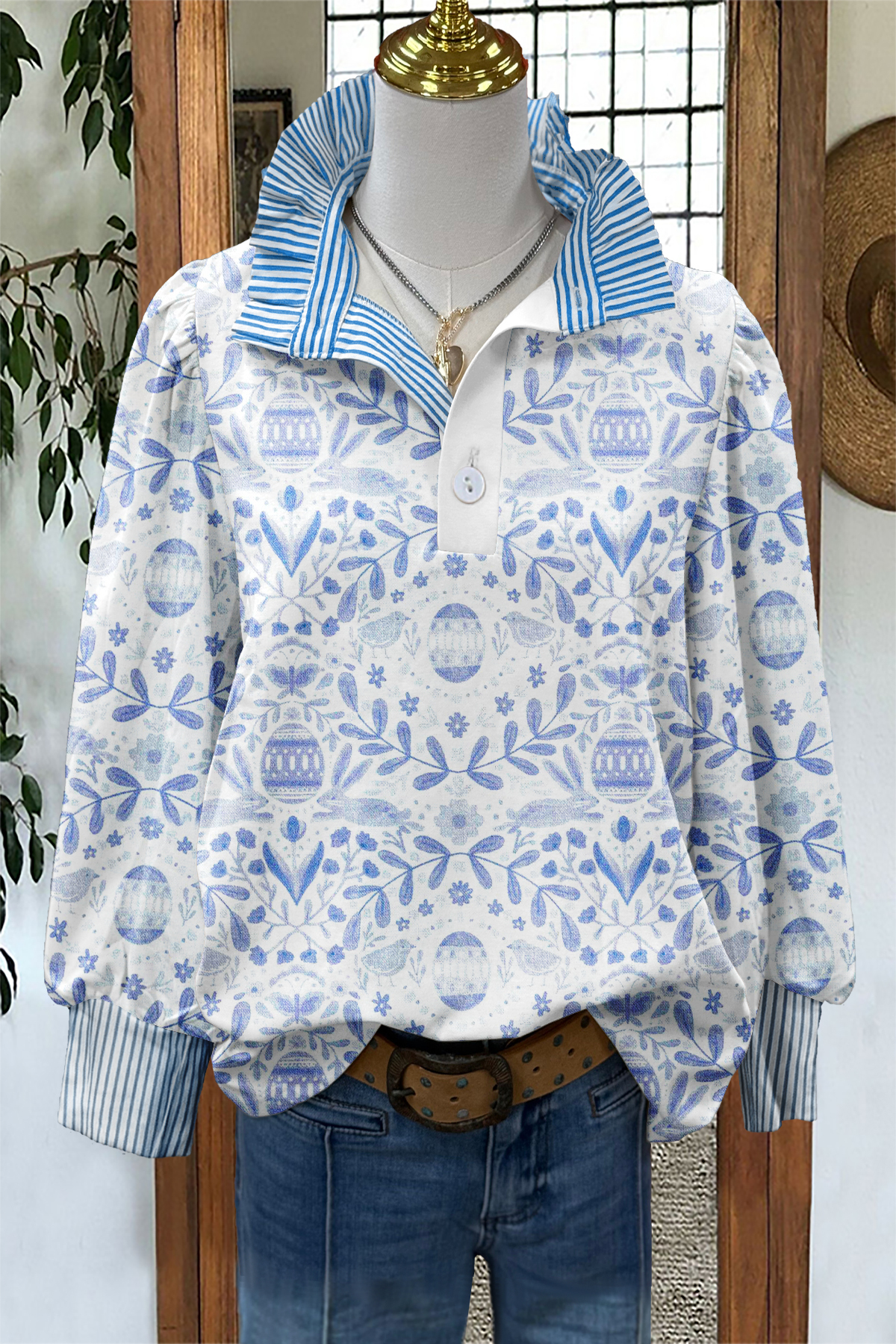 Classic Easter Egg Print Striped Blouse