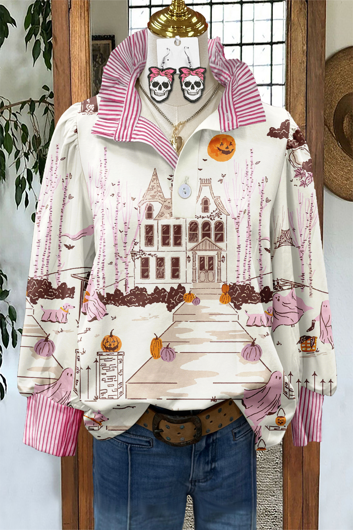 Cute Halloween Ghost Pumpkin Striped Blouse