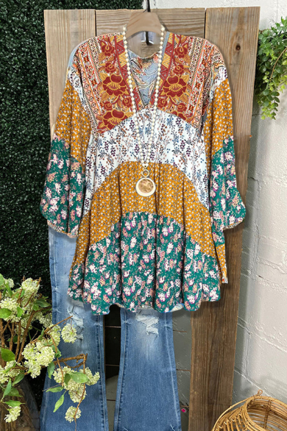 Stay on trend this season in our new elegant, v neck top. We especially love the patchwork fabric and think this piece will be a new favorite in your closet!