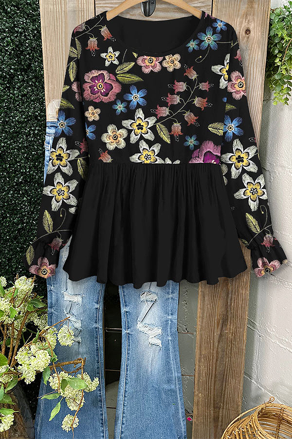 Romantic Embroidered Floral Style Ruffle Sleeve Top