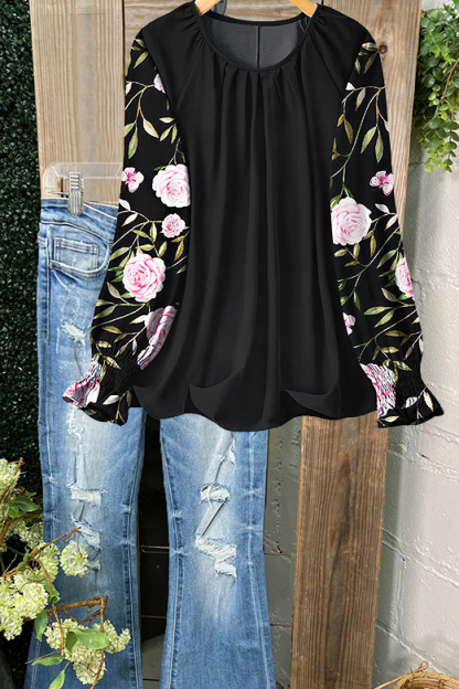 Elegant Floral Patchwork Ruched Ruffle Sleeve Top