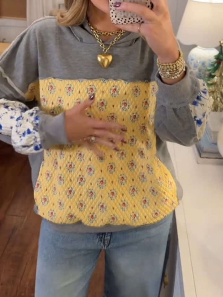 Stay on trend this season in our new stylish,cozy, hood top. We especially love the patchwork fabric and think this piece will be a new favorite in your closet!