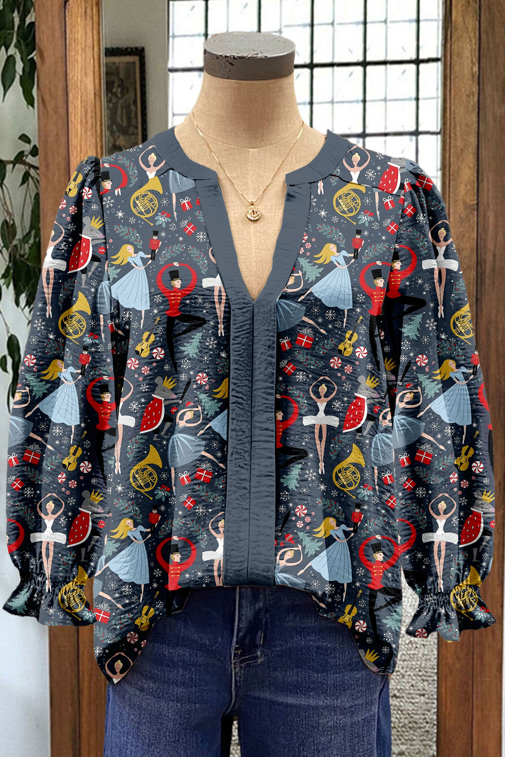 Christmas Nutcracker Ballet Print Contrast Panel V-neck Top