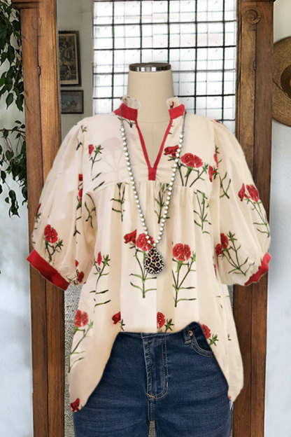 Stay on trend this season in our new casual, v neck blouse. We especially love the floral print fabric and think this piece will be a new favorite in your closet!