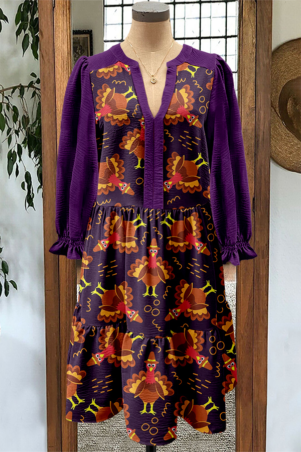 Only 1 Piece Left: Purple Thanksgiving Turkey Print V-neck Puff Sleeve Dress