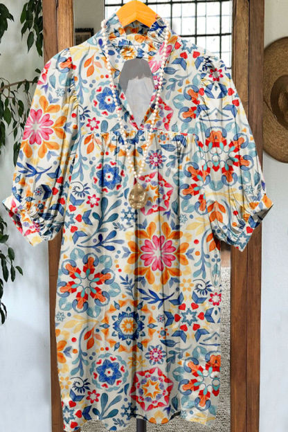 Elegant Puff Sleeve Easter Print Midi Dress