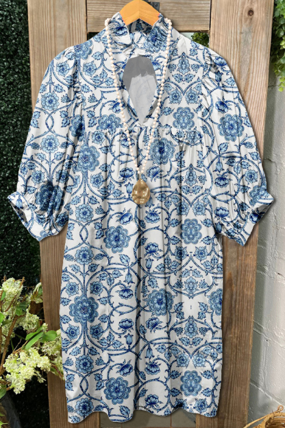Stay on trend this season in our new elegant, v neck dress. We especially love the graphic print fabric and think this piece will be a new favorite in your closet!