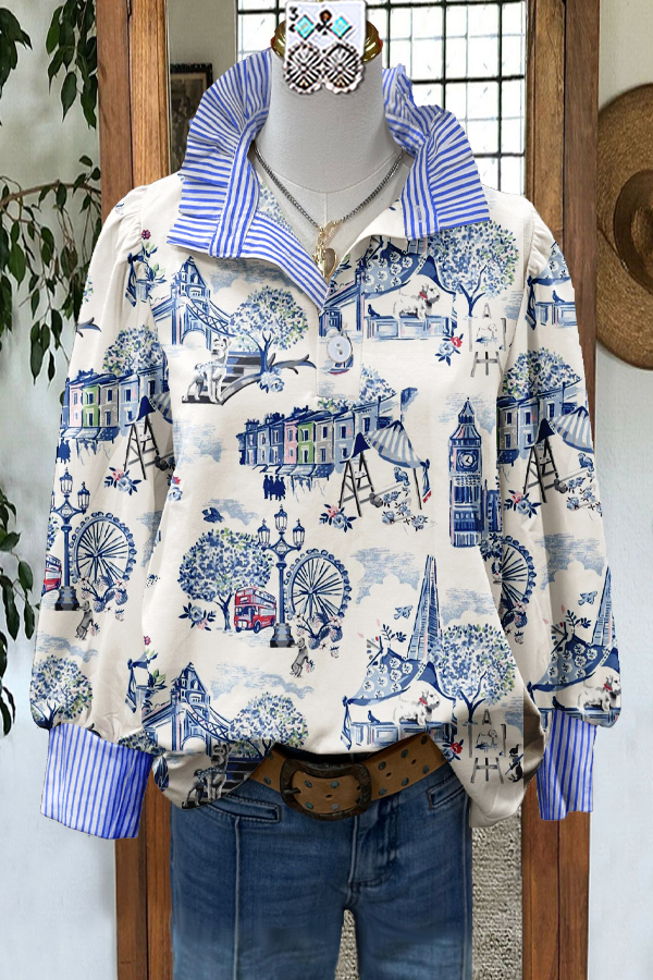 Elegant Contrast Color Stitching Graphic Print Blouse