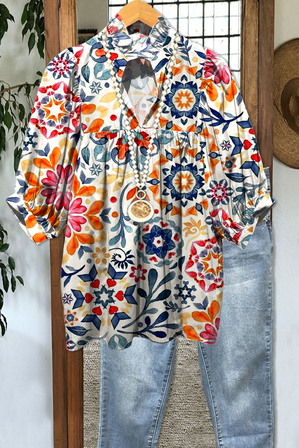 Stay on trend this season in our new elegant, v neck top. We especially love the graphic print fabric and think this piece will be a new favorite in your closet!
