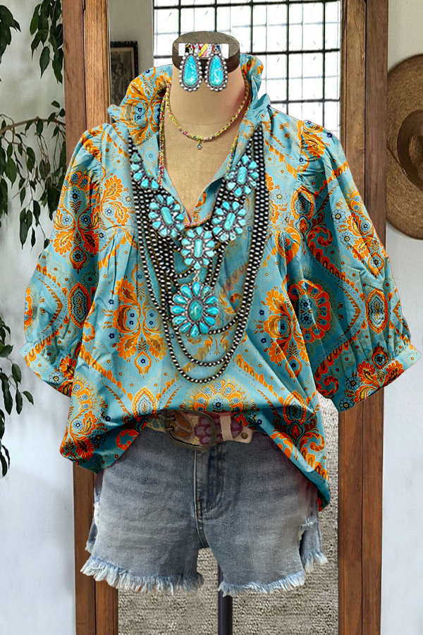 Stay on trend this season in our new elegant, v neck top. We especially love the graphic print fabric and think this piece will be a new favorite in your closet!