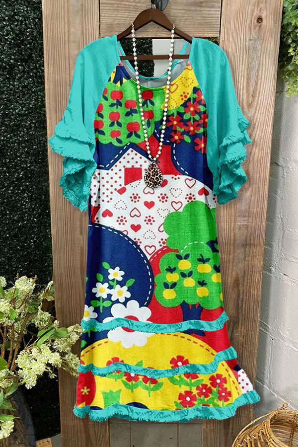 Contrast Retro Illustration Raglan Midi Dress