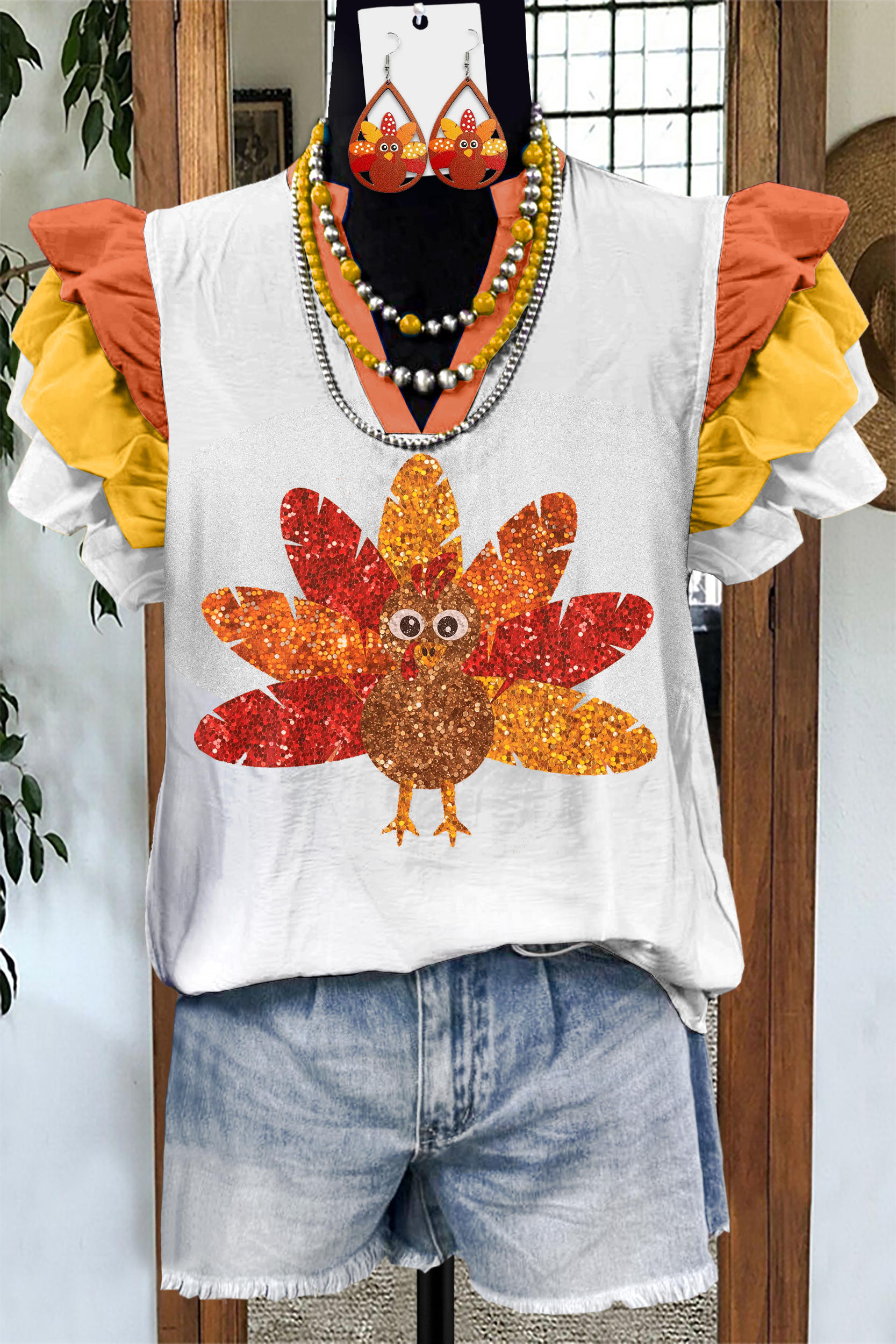 Classic Thanksgiving Turkey Print Fly Sleeve Blouse