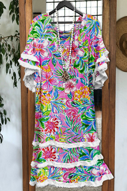 Stay on trend this season in our new elegant, round neck dress. We especially love the flower print fabric and think this piece will be a new favorite in your closet!