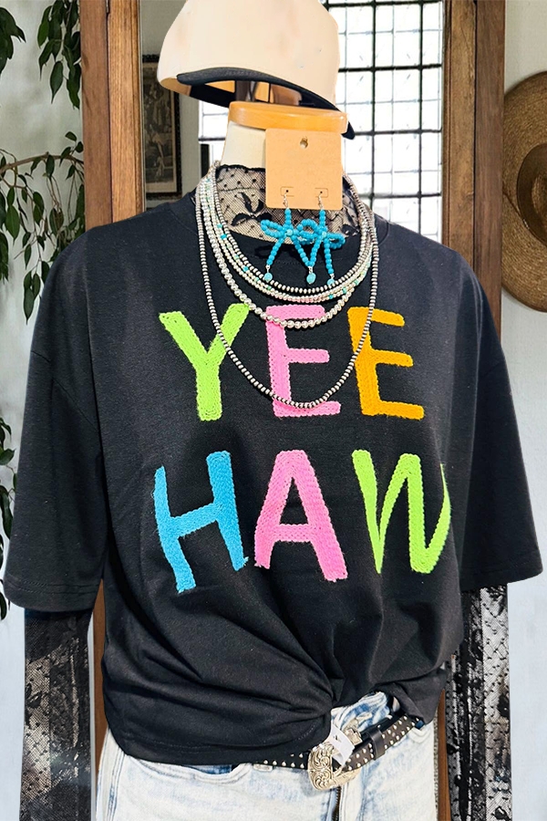 Stay on trend this season in our new casual, round neck t-shirt. We especially love the slogan fabric and think this piece will be a new favorite in your closet!