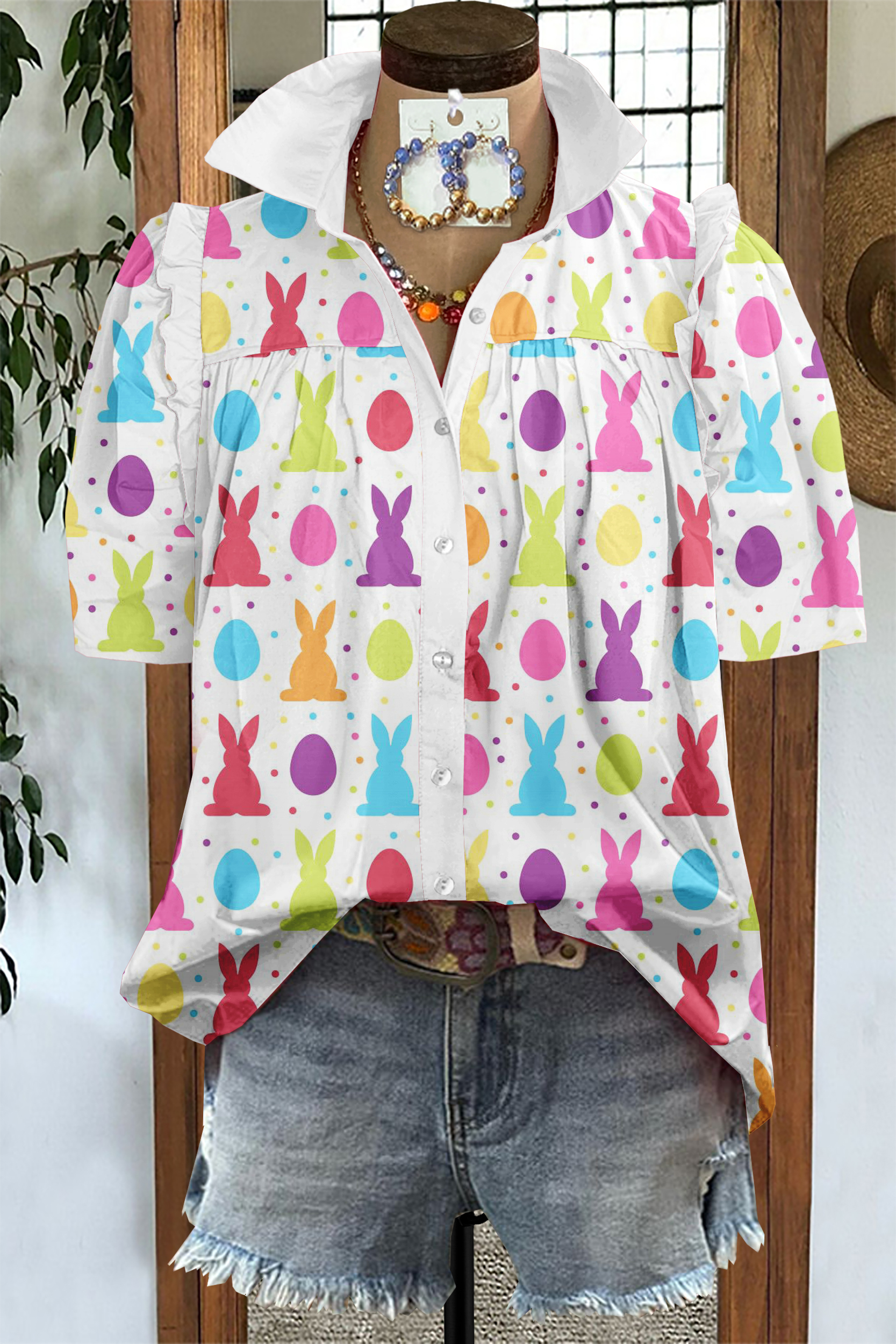 Cute Easter Bunny Print Puff Sleeve Blouse
