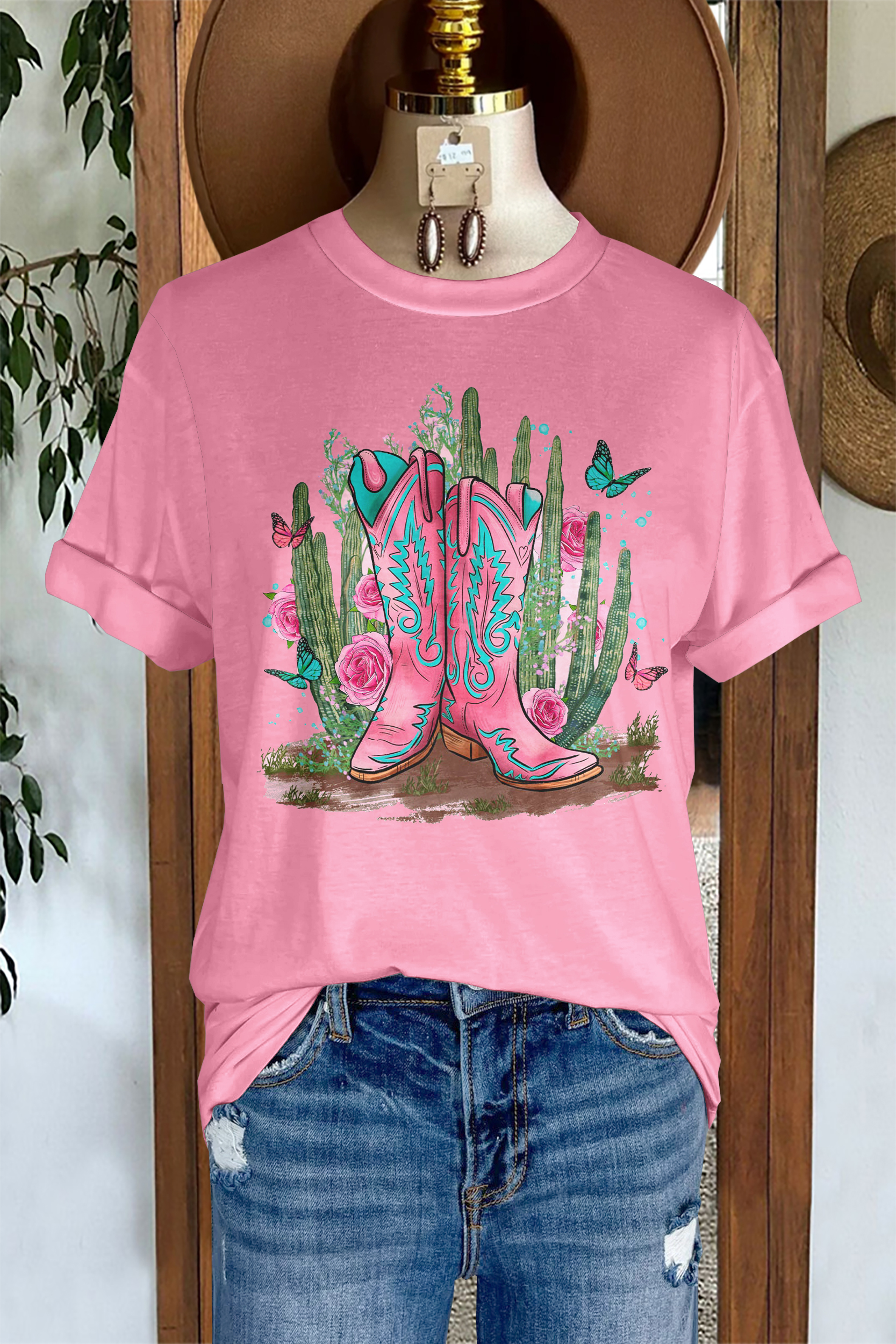Casual Western Boots Cactus Print T-Shirt
