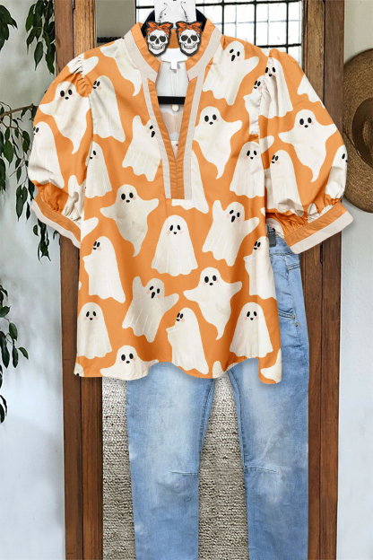 Cute Halloween Ghost Print Puff Sleeve Blouse