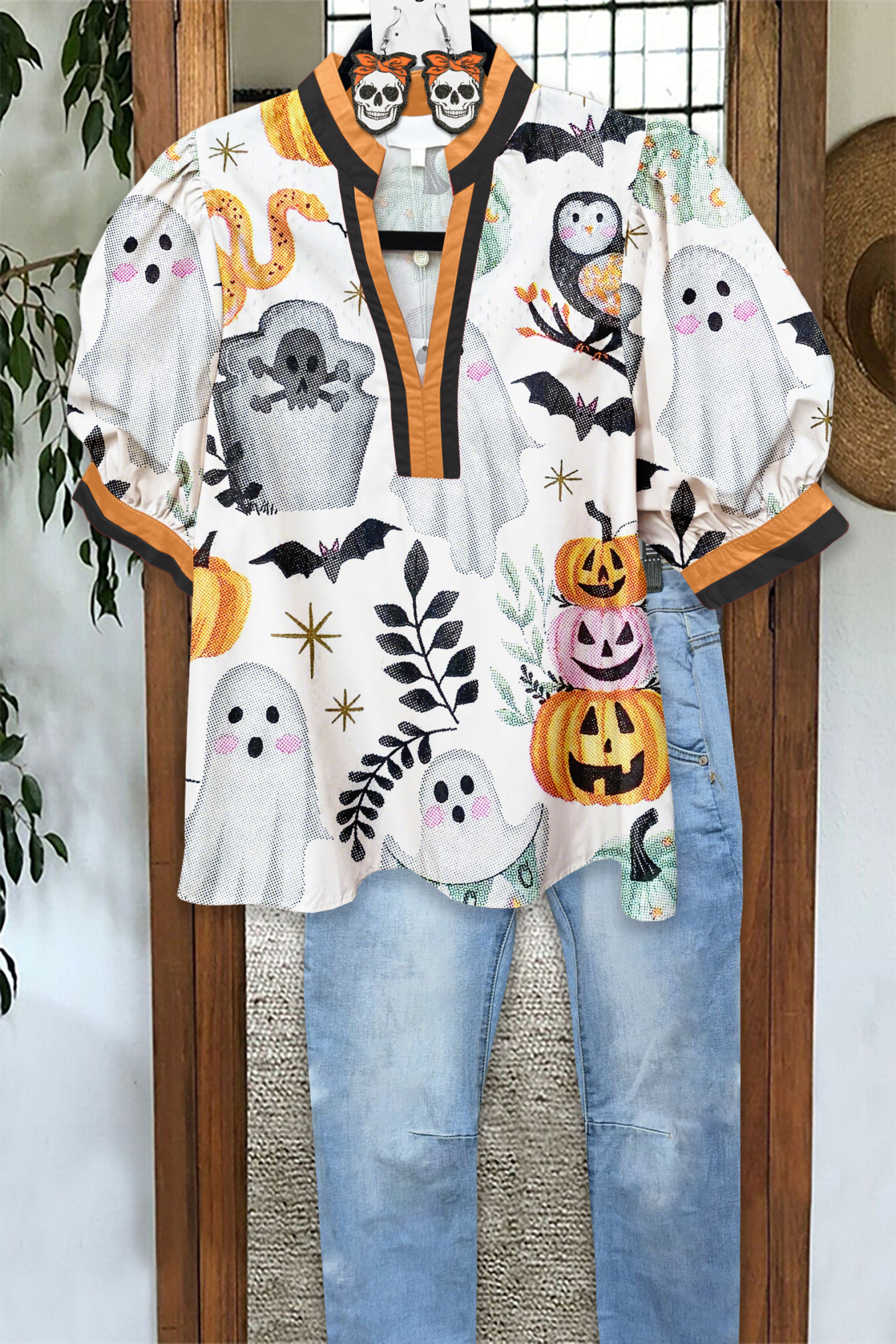 Cute Halloween Ghost Pumpkin Puff Sleeve Blouse