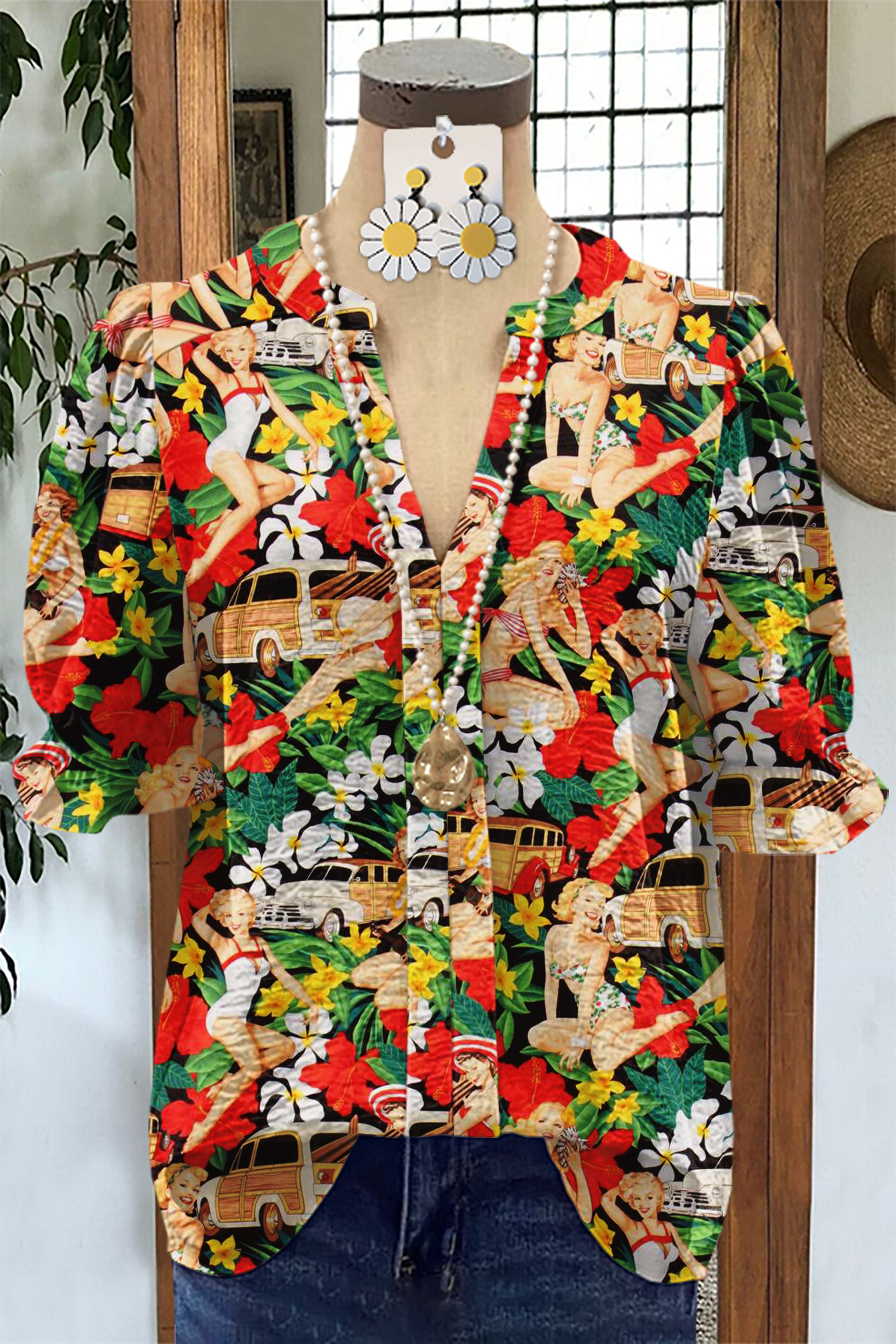 Floral Solid Color Pleated Puff Sleeve Blouse