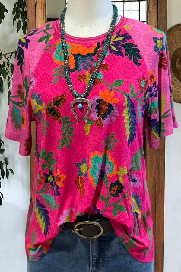 Stay on trend this season in our new pretty, round neck t-shirt. We especially love the abstract print fabric and think this piece will be a new favorite in your closet!