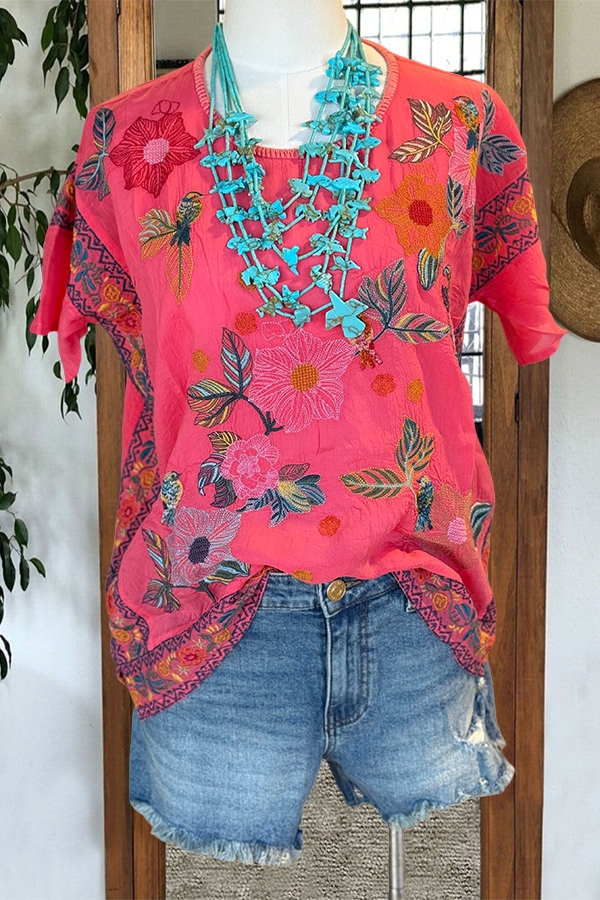 Stay on trend this season in our new pretty, round neck t-shirt. We especially love the abstract print fabric and think this piece will be a new favorite in your closet!