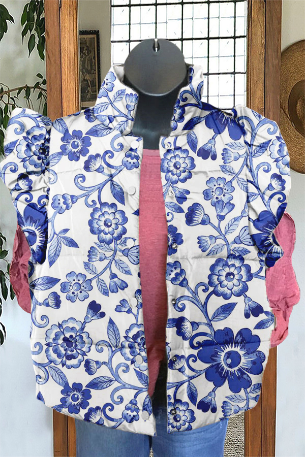 Elegant Blue Floral Print Ruffle Vest