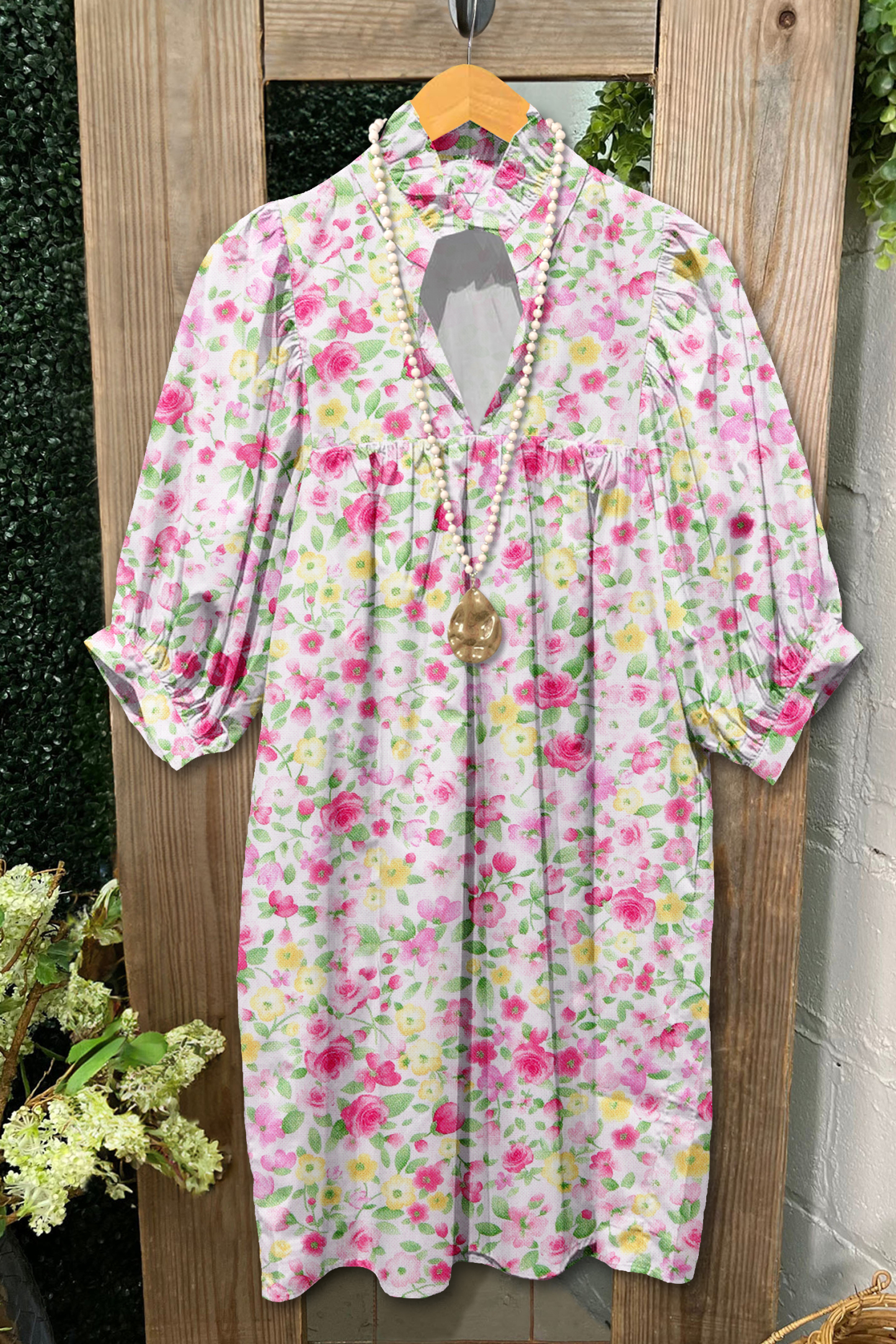 Stay on trend this season in our new retro, v neck dress. We especially love the flower print fabric and think this piece will be a new favorite in your closet!