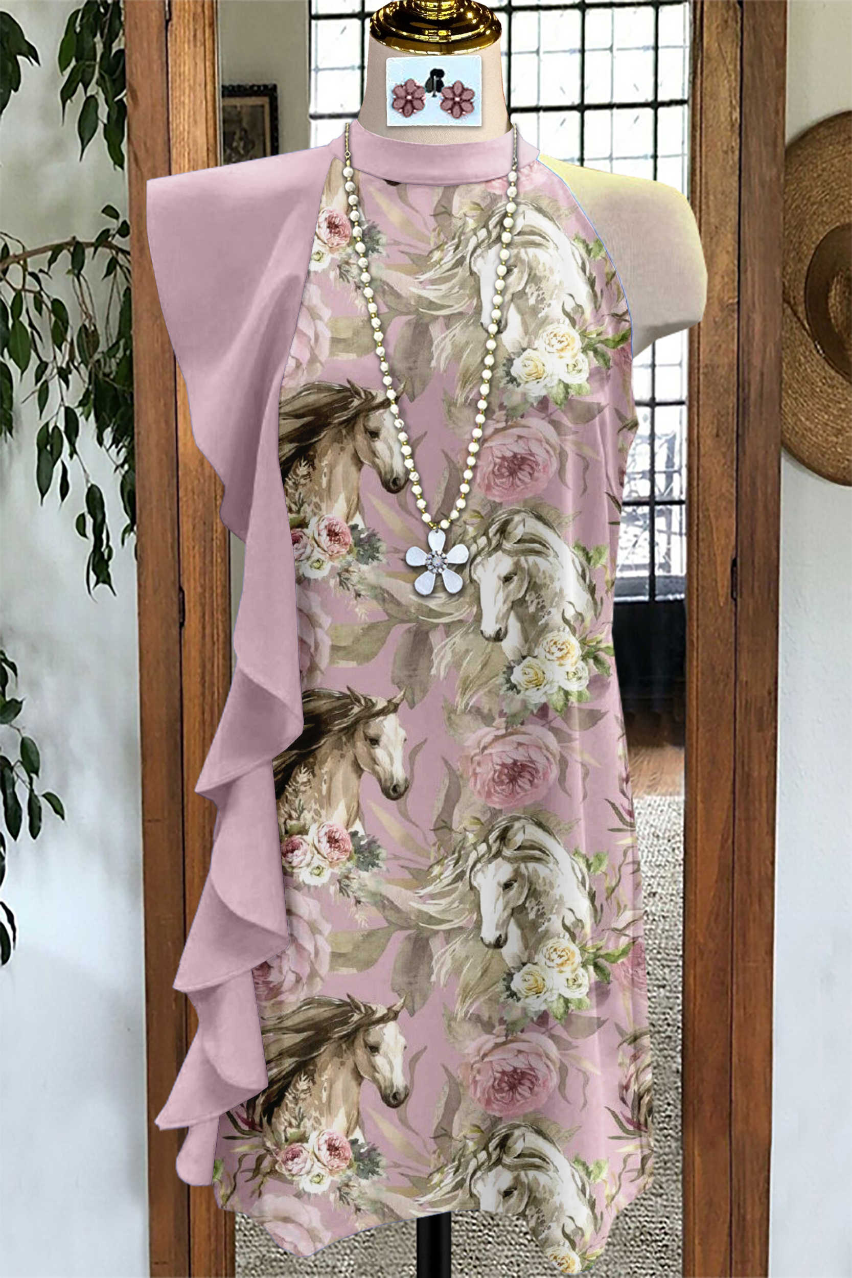 Western Horse Flower Print Asymmetric Ruffle Dress